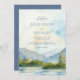 Convite de casamento de montanha com design cênico de aquarela em tons de azul empoeirado e verde. A cena do lago apresenta montanhas, verde e pinheiros, o lago e um céu leve. Todo o texto é editável, incluindo a introdução "junte-se a nós nas montanhas". Se você quiser produtos correspondentes, por favor, navegue na minha coleção Mountain Lake.