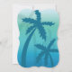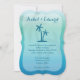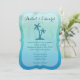 Design de convite de casamento tropical apresentando algumas silhuetas de palmeira. O fundo é um gradiente azul aqua retratando um oceano tropical. As áreas de texto personalizáveis estão em cor azul.