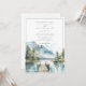 Um lago idílico de floresta aquícola em blues e verduras moles, com um píer na borda do lago, com árvores e montanhas cada vez verdes à distância. Russo e sereno. Fronteira ao redor da design. Disponível em impressão, como download digital ou ambos. Adequado para um casamento de floresta de montanha, casamento de natureza selvagem ao ar livre e casamento ao lado do lago.