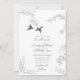 Este convite de casamento mostra um casal de pássaros voando sobre belos esboços simples de ramos e flores. Esta design de jardim encantadora é feita em cinzas e branca com uma luz empoeirada e rosa.