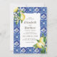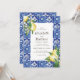 Composto por tipografia serif e escrita cursiva. Tudo contra um pano de fundo de aquarela de azulejos espanhóis mediterrânicos azuis e brancos com folhas de folhagem verde, limões e botânicos florais selvagens. Este foi projetado pelo White Paper Birch Co., exclusivo para Zazzle. Disponível aqui: http://www.zazzle.com/store/whitepaperbirch