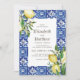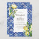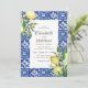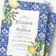 Composto por tipografia serif e escrita cursiva. Tudo contra um pano de fundo de aquarela de azulejos espanhóis mediterrânicos azuis e brancos com folhas de folhagem verde, limões e botânicos florais selvagens. Este foi projetado pelo White Paper Birch Co., exclusivo para Zazzle. Disponível aqui: http://www.zazzle.com/store/whitepaperbirch