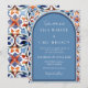 Celebre o seu casamento moderno e luxuoso com este design ousado e elegante, perfeito para um casal sofisticado. Os azulejos elegantes azuis e vermelhos exalam sofisticação, definindo o tom para uma celebração vibrante de verão ou primavera.