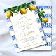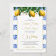 Bellisimo Eleve seu dia especial de casamento com este azulejo azul, inspirado em italiano, e limões botânicos de cor branca e dourada, stripe Wedding Invitation. Um design muito elegante. Um convite personalizado com suas informações é facilmente inserido no modelo. O design eterno de limões ensolarados e a faixa azul de azulejo invocam uma vibração de verão para o seu dia especial. Torne este design exclusivo seu.
