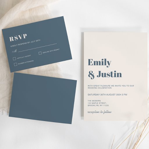 Marinho minimalista moderno Convite para Casamento de Cerco Azul. Um convite de casamento com uma design moderna minimalista em azul escuro e cores beges. É perfeito para comemorações de casamento no estilo moderno.