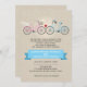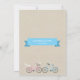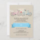 Casamentos com temas de bicicleta são uma nova e divertida tendência nos casamentos temáticos. Neste convite de casamento de fundo falso, duas bicicletas se encontram e criam um pequeno coração para simbolizar o casal a ser casado. A bicicleta da noiva tem um véu de casamento no assento e um buquê na cesta. A bicicleta do noivo tem uma gravata de arco ao redor dos guiões. Os nomes dos casais se destacam em uma faixa azul-céu na frente e atrás. Disponível em cores alternativas com uma opção de bicicleta tandem.