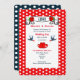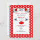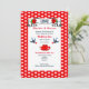 Um divertido e colorido convite vermelho, estilo Rockabilly, estilo vermelho, branco e azul marinho, da década de 1950, com rosas, corações, andorinhas e gráficos especiais de bolinhas. Ideal para casais que amam os estilos antigos e procuram algo um pouco diferente.