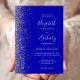 A margem esquerda deste elegante convite de casamento moderno apresenta um design de cintilação de prata. O texto personalizável combina manuscrito branco, fontes em copperplate e itálico em um fundo azul real. O verso apresenta um design brilhante real e prateado.