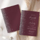 A margem esquerda deste elegante convite de casamento moderno apresenta um design de cintilação de prata. O texto personalizável combina a escrita manual de cinzas prateadas, fontes em copperplate e itálico em um fundo de burlagem escura. O lado inverso apresenta um design de burgundy e brilho prateado.