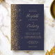 A borda esquerda deste elegante convite de casamento moderno apresenta um design dourado falso. O texto personalizável combina manuscrito colorido de ouro pálido, fontes copperplate e itálico em um fundo azul escuro. O verso apresenta um design de brilho azul escuro e dourado.