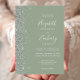 A margem esquerda deste elegante convite de casamento moderno apresenta um design de cintilação de prata. O texto personalizável combina manuscrito branco, fontes em copperplate e itálico em um fundo verde sábio. O verso apresenta um design verde-sábio e cinza-prateado correspondentes.