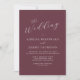 Este simples e elegante convite de casamento moderno traz um texto branco sobre um fundo burgundy. As palavras "O Casamento" aparecem na escrita da na moda. Adicione os nomes dos casais na fonte do serif e o texto restante no sans serif. O lado inverso é sólido.