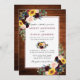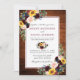 O Convite para Casamento Floral Moderno Elegante Watercolor Burgundy inclui rosas burguentos, rosas cor-de-rosa, flores vermelhas, flores azuis, girassóis, folhas de eucalipto e verde botânico. Madeira russa do campo.