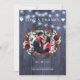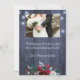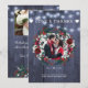 Obrigado de casamento no inverno russo você cartão com fotos com flores de rosas de melancia de cor branca e vermelha, de lata-lama, e flores com ramos de abeto verde de caçador de pinheiros sazonais e bagas ocas sobre uma madeira azul-celo de marinho escuro como fundo com luzes de cordas.+++++ Personalize com 2 fotos (um quadrado na frente e uma paisagem no verso), com sua assinatura e texto na frente e trás! +++++++++++++ Adequado para o inverno Casamentos de fazendas de campo rústicos no Natal.