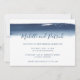 Convite de casamento horizontal moderno e criativo, com um simples design com um marinho azul de pincelada de aquarela no topo, sobre um fundo branco. Seus nomes se sobrepõem ao pincelada em uma fonte manuscrita e seus detalhes de casamento estão em uma fonte sans serif. A parte de trás é um azul marinho sólido. Esses convites exclusivos são excelente de um casal artístico.