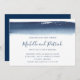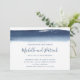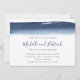 Convite de casamento horizontal moderno e criativo, com um simples design com um marinho azul de pincelada de aquarela no topo, sobre um fundo branco. Abaixo estão seus nomes em uma fonte manuscrita e seus detalhes de casamento em uma fonte sans serif. A parte de trás é um azul marinho sólido. Esses convites exclusivos são excelente de um casal artístico.