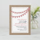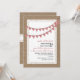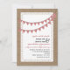 Um convite casual de casamento com uma ilustração de um beliche que é gingham vermelho sobre um design de renda inspirado na frente. O fundo na frente e atrás é inspirado em burlap. Personalize o texto com detalhes da sua ocasião.