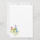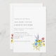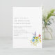 Um bonito convite para o casamento, com buquê aquoso de flores silvestres em cores vibrantes, de azul, amarelo, roxo e rosa, com folhas verdes, sobre fundo branco limpo. O buquê também está no reverso do convite Personalizar com seus detalhes em cinzas escuras.