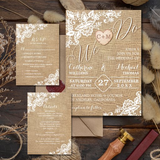 Procurando a perfeita design de casamento russo? Não olhe mais do que arromba e renda! O design de arrombamento e renda apresenta um delicado local branco, emparelhado com uma toca natural, criando um olhar encantador e rústico que é perfeito para qualquer casamento no campo. O rendas floral adiciona um toque de elegância, enquanto o burlap proporciona uma sensação rústica. O design também incorpora elementos de madeira, somando ao sentido natural e rústico do tema burlap e lace. E para um toque personalizado, adicione seu monograma a este design.