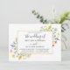 O Convite para Casamento de Flores Selvagens Modernas inclui as delicadas flores amarelas, cor-de-rosa, cor de pêssego, azuis empoeirado, verdes, roxas, vermelhas e laranja, papoilas, folhas de eucalipto e outras lindas culturas botânicas numa armação de ouro. Script Elegante De Caligrafia.