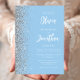 A borda esquerda deste elegante convite de casamento moderno apresenta uma borda falsa de prata. O texto personalizável combina o script branco e sans serif fonts em um plano de fundo azul pastel. O verso apresenta um design azul-bebê e prata correspondentes.