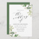 Convites de casamento elegantes, botânicos, com folhagem de aquarela em tons de primavera e musgo verdes nos cantos da design. A frase "O Casamento de" é exibida em um roteiro de caligrafia. Personalize o convite de casamento Boho Greenery com seus nomes. O convite de casamento botânico moderno é perfeito para casamentos de primavera e verão.