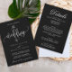 Um convite para casamento elegante, moderno e delicado de um roteiro de caligrafia negra que você pode personalizar com suas informações para torná-lo ainda especial. A design romântica minimalista apresenta uma magnífica e elegante tipografia em um belo fundo com uma aparência simples e limpa. Salve o papel, incluindo os detalhes na parte traseira do convite de casamento, em vez de em um cartão de cercado separado. Inclua as informações de RSVP também se seu convidado estiver respondendo eletronicamente (opcional).