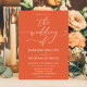 Convide seus convidados para comemorar seu dia especial com este convite de casamento moderno e chique. O vibrante fundo laranja Verona Sunset cria uma atmosfera quente e convidativa. A caligrafia elegante combinada com uma fonte sans-serif limpa adiciona um toque de sofisticação. Personalize com seus detalhes de casamento.