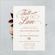 Um romântico, elegante, simples, clássico e moderno modelo de convite para casamento para os meses de outono - setembro, outubro, novembro. Apresenta uma caligrafia moderna e elegante com amplos florescimentos e o título "queda no amor" e um simples ramo das folhas de outono, o pássaro de cobre. Luxuoso, mas simples, clássico, mas chique, moderno, mas eterno. Uma escolha encantadora para um casamento no outono com cobre, laranja queimada, terracota, bege, vermelho, laranja e outras matizes de outono.
