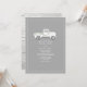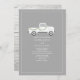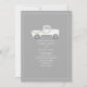 Convite de casamento com ilustração de um caminhão de colheita branco decorado com verde floral branco. O plano de fundo é uma cinza com texto branco e borda de listras. O reverso apresenta a imagem de bloco branco.
