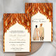 Incêndios para seus convidados com este elegante convite de casamento indiano com um belo arco decorado com cortinas e lanternas penduradas com ilustrações de casal personalizáveis em várias combinações de cores de sherwani, lehenga e turban. Basta adicionar os detalhes do seu evento neste modelo fácil de usar para torná-lo um convite de tipo único.