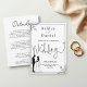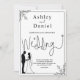 Este elegante convite de casamento preto e branco é perfeito para um casamento moderno. O simples design apresenta uma caligrafia preta elegante, um quadro preto chic e uma ilustração noiva e noiva sobre um fundo branco limpo. O cartão de convite inclui os detalhes do casamento no verso, em vez de pagar um cartão separado.