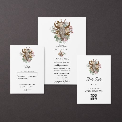 Um design moderno estilo de vaqueiro ocidental, com elementos de Boho Floral Cow Skull e Horsferes. Design de casamento floral Neutral Boho, com flores a aquarela entrelaçadas no crânio e ferraduras de vaca. Esta moderna design de casamento do país ocidental é ideal para todas as estações. Um design de rancho elegante, fazenda ou estilo celeiro com rosas de aparência boêmica neutra e suas ilustrações de aquarela verde. Um cowboy do País Ocidental temeu design de convite de casamento com elementos elegantes modernos. Também estão disponíveis itens de papelaria de casamento e outros formatos de convite de casamento.