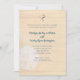 Modelo da cerimônia de casamento costeira com dólar branco e design de madeira. Dois corações no topo representam o amor do casal e o texto é azul escuro. A amostra de texto começa com "A honra de sua presença é solicitada" com nomes do casal no script e mais informações de cerimônia abaixo. Design de madeira clara em ambos os lados.