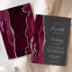 A borda esquerda deste elegante convite de casamento moderno apresenta uma cor d'água borrifada com borda cortada com cintilação falsa de prata. O texto personalizável combina manuscrito, copperplate e fontes itálicas em branco em um fundo de cinza de carvão. O lado inverso apresenta um design de burgundy e agate prateado.