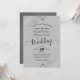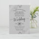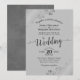 Este belo convite para o casamento apresenta um design simples, mas elegante, com uma caligrafia de escrita falada sobre um fundo de cinza e um filigre de folha fina de cinza prateada nos cantos. A formulação é formal, mas a disposição é moderna e na moda.