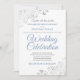 Convide seus convidados para compartilhar suas comemorações do casamento com esses convites elegantes. Apresenta texto de script elegante azul claro e cinza em um fundo branco com um filigre de folha azul prateado nos cantos. Design simples com palavras formais para tornar seu casamento realmente especial.
