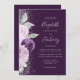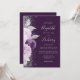 O canto esquerdo deste elegante convite para casamento moderno apresenta um buquê floral em tons de roxo e lavanda, aparado com folha de falso prateado e folhagem falsa e aspergido com brilho de prata. O texto personalizável combina o script de escrita manual de cinzas prateadas pálidas, fontes em copperplate e itálico em um fundo roxo profundo. O verso fornece espaço para detalhes do casamento em um fundo roxo sólido, junto com um código QR que os convidados podem digitalizar para visitar seu site e RSVP, o que economiza o custo de imprimir e enviar cartões RSVP separados.