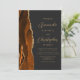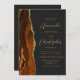 A borda esquerda deste elegante convite de casamento moderno apresenta uma cor de água laranja queimada, aparada com falsa brilho dourado. O texto personalizável combina o script dourado e as fontes sans serif em um fundo preto de slate. O verso fornece espaço para detalhes do casamento em um fundo preto de slate sólido, junto com um código QR que os convidados podem digitalizar para visitar seu site e RSVP, o que economiza o custo de imprimir e enviar cartas RSVP separadas.