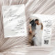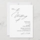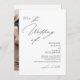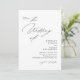 O convite para o casamento apresenta um design minimalista, elegante, com um fundo branco limpo e uma combinação de moderno roteiro e fontes serif. O lado frontal inclui um pedido para se juntar à celebração, com "O Casamento de" em estilo cursivo proeminente, seguido pelos nomes dos casais em negrito serif e os detalhes do evento em formato claro e direto. O verso mostra uma foto de arco do casal que pode ser personalizada, com texto para detalhes de RSVP em script correspondente e um código qr.