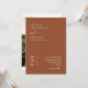 Este convite apresenta uma elegante caligrafia e uma simples fonte de tipografia sans serif em um fundo de terracota com uma fotografia em forma de arco e um código QR. A simplicidade e a design limpa deste convite funciona bem com todos os temas de casamento e definitivamente uma adição excelente ao seu casamento. Basta personalizar os nomes e o texto em alguns passos fáceis e personalizar o cartão de convite com sua foto do casal feliz e substituir o Código QR pelo seu no verso do convite para dar um toque pessoal agradável ao seu convite. Note-se que a elegante caligrafia do texto, "e" na frente e no verso do cartão, assim como a trabalho de arte gráfica de "recepção para seguir" e outros elementos gráficos, não podem ser editados, apagados ou movidos. Eles estão consertados. Se precisar alterar a cor, você pode personalizar o cartão de convite. Você pode personalizar e personalizar o convite para ajustado das suas necessidades de evento de casamento e clicar em personalizar o convite. Você pode personalizar facilmente este convite com seu próprio texto e compartilhá-lo com seus convidados digitalmente — seja através de texto, email ou mídia social. Se preferir, você também tem a opção de enviar uma versão impressa para seus convidados. Ou, você pode fazer ambos — enviar uma versão digital e acompanhar com uma cópia impressa para um toque pessoal!