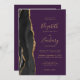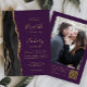 A borda esquerda deste elegante convite de casamento moderno apresenta uma coloração aquosa preta, borda agitada, aparada com falso brilho dourado. O texto personalizável combina manuscrito dourado, fontes em copperplate e itálico em fundo roxo profundo. Adicione sua foto favorita ao verso, juntamente com texto adicional e um código QR para enviar convidados para o site do seu casamento.