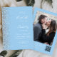 A margem esquerda deste elegante convite de casamento moderno apresenta um design de cintilação de prata. O texto personalizável combina manuscrito branco, fontes em copperplate e itálico em um fundo azul pastel de bebê. Adicione sua foto favorita ao verso, juntamente com texto adicional e um código QR para enviar convidados para o site do seu casamento.