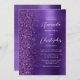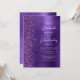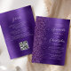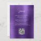 A borda esquerda deste elegante convite de casamento moderno apresenta uma borda suja e falsa roxa. O texto personalizável combina manuscrito branco, fontes em copperplate e itálico em um fundo de metal escovado roxo e falso. O verso fornece espaço para detalhes do casamento em um fundo de metal escovado roxo, juntamente com um código QR que os convidados podem digitalizar para visitar seu site e RSVP, o que economiza o custo de imprimir e enviar cartões RSVP separados.