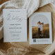 Precisa de um convite elegante e minimalista para o casamento? Nosso design apresenta um quadro fotográfico de arco, tipografia moderna de script e código QR para seu site de casamento. Adicione um toque único e elegante ao seu dia especial com nossos convites para casamento de fotos! Fotos de prostooleh / Freepik.
