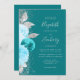 O canto esquerdo deste elegante convite para casamento moderno apresenta um buquê floral em tons de turquesa e azul claro, aparado com folha de falso prateado e folhagem falsa e aspergido com brilho de prata. O texto personalizável combina o script de escrita manual de cinzas de prata pálida, fontes copperplate e itálico em um fundo de turquesa. O verso oferece espaço para detalhes do casamento, juntamente com um código QR que os convidados podem digitalizar para visitar seu site e RSVP, o que economiza o custo de impressão e envio de cartões RSVP separados.