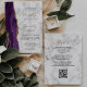 A borda esquerda deste elegante convite de casamento moderno apresenta uma cor d'água roxa, borda agitada, aparada com falso brilho dourado. O texto personalizável combina manuscrito dourado com fontes em preto e em itálico em fundo branco e cinza. O verso fornece espaço para detalhes do casamento em um fundo de mármore, junto com um código QR que os convidados podem digitalizar para visitar seu site e RSVP, o que economiza o custo de imprimir e enviar cartões RSVP separados.