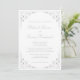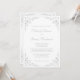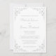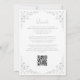 Este elegante convite de casamento formal inspirado na vintage apresenta o texto em um roteiro de cor prateada e fontes serif, enquadrado por um delicado motif de prata de vintage. O verso oferece espaço para detalhes do casamento, juntamente com um código QR que os convidados podem digitalizar para visitar seu site e RSVP, o que economiza o custo de impressão e envio de cartões RSVP separados.