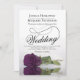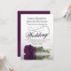 Este belo convite para o casamento apresenta uma bela fotografia de um solteiro de púrpura de ameixa enrolada ou rosa de berinjela ao seu lado, refletindo numa piscina de água com ondas e ondulações. O design apresenta um roteiro de caligrafia rico com um fazer de cauda longa e encaracolada, moderno e clássico. Uma maneira elegante, sofisticada e chique de convidar seus amigos e família para compartilhar seu dia especial. A parte traseira do cartão tem um código QR para o seu site de casamento e uma breve nota instruindo as pessoas a visitar o site para obter detalhes e RSVP.