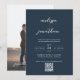 Um simples e moderno convite de casamento tradicional para na moda com um roteiro elegante de caligrafia e um código QR para fácil rsvp e detalhes para o seu casamento. Há uma foto de cheio na parte de trás que você pode facilmente mudar com seus Nomes e data de casamento.